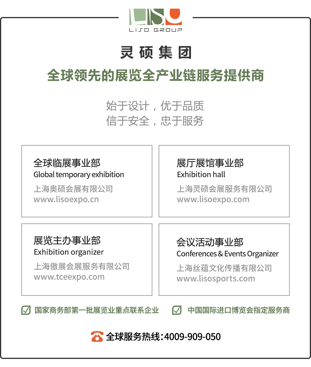 靈碩集團是一家專注全球展覽全產業鏈服務的品牌營銷商,集團旗下四大子公司業務涵蓋國內展覽設計搭建、國外展覽設計搭建、多媒體智能展廳展館設計搭建、專業展會主辦、國內外會議活動策劃等多項展覽前沿領域。靈碩作為專業的會展公司,擁有多項會展行業榮譽資質,被國家商務部選為第一批展覽業重點聯系企業,同時也是上海展會。靈碩集團的宗旨始終是以客戶為中心,做值得信賴的受托者,用創意與服務,幫助企業提升品牌形象,助力企業加大品牌的全球影響力。