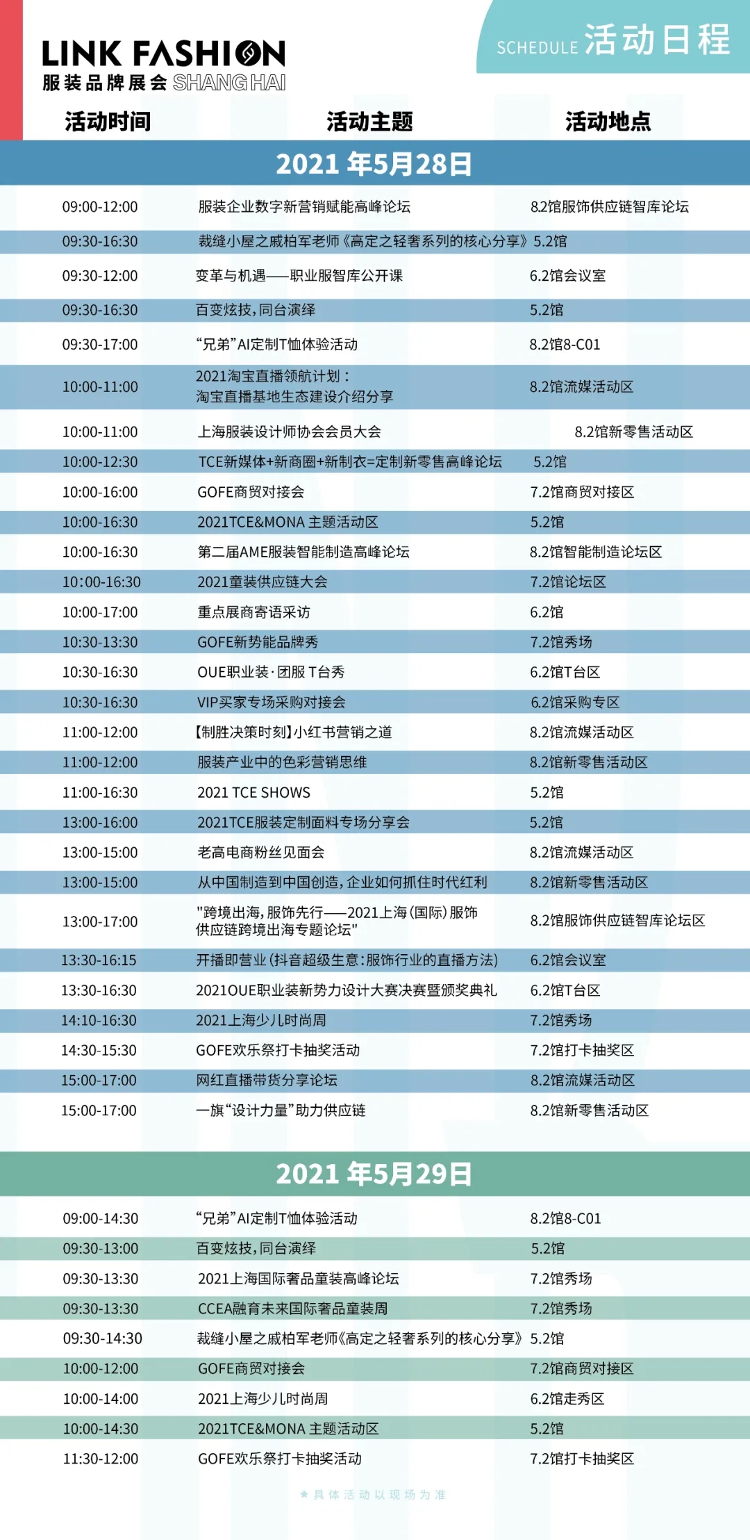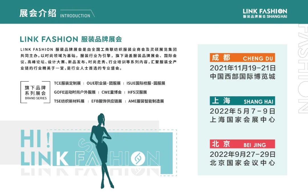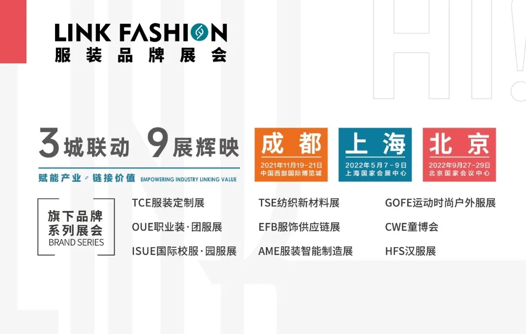 2021年11月19-21日LINK FASHION將登陸成都,助力企業開拓西南市場,2022年5月7-9日上海國家會展中心、2022年9月27-29日北京國家會議中心,即將華麗召開。感謝廣大紡織服裝企業對LINK FASHION的大力支持,未來我們將繼續通過市場化運作,為客戶持續創造價值!